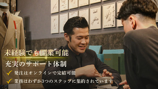 初めての事業でも挑戦しやすいよう、開業のハードルをとことんまで下げています。副業でも取り組めるため、オーダースーツ事業に少しでもご興味をお持ちいただけましたらお気軽にお問い合わせください。