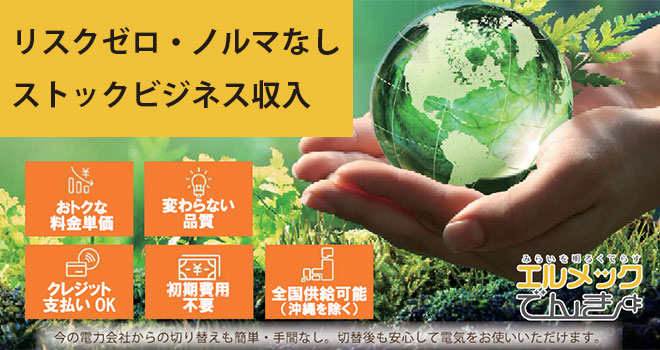 【代理店募集】リスクゼロ!ノルマなし!在庫不要で始める安定ストックビジネス!エルメックでんき販売パートナー募集!